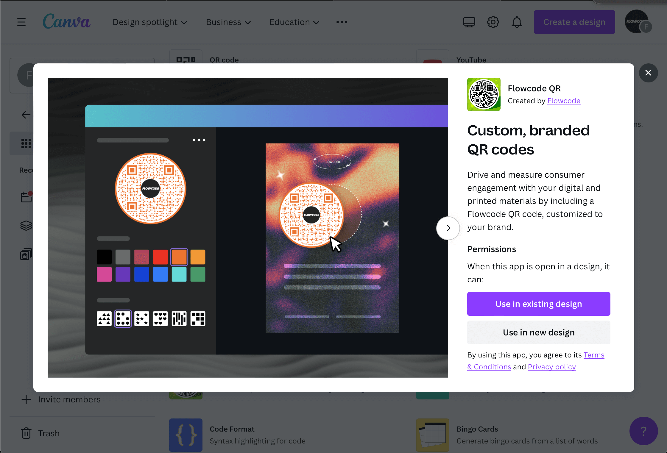 Search 'QR' in their platform, and Sign In/Sign Up to Flowcode and create a code within the Canva platform that gets added directly to your design.
